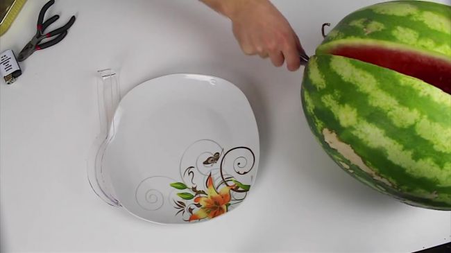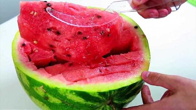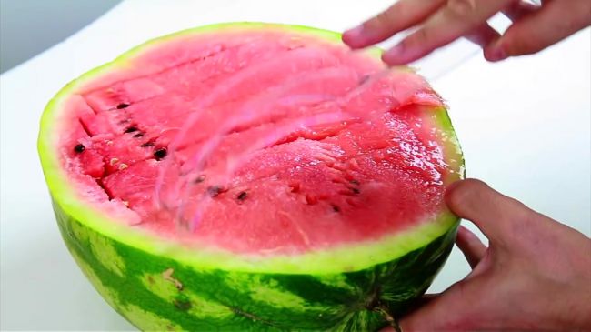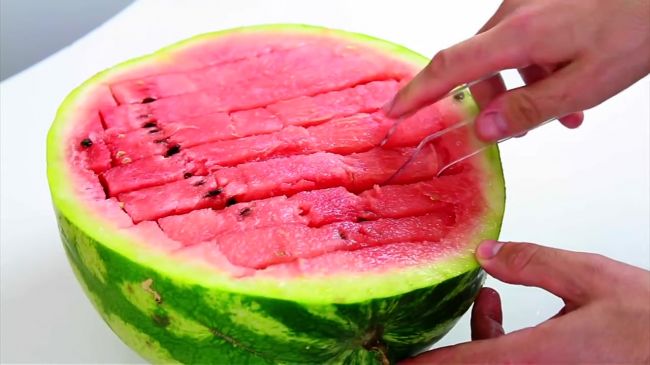Перед резкой изготовленным нами ножом арбуз нужно разрезать вдоль обычным.