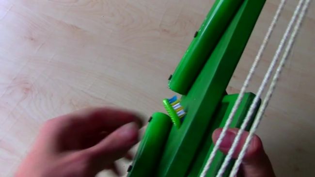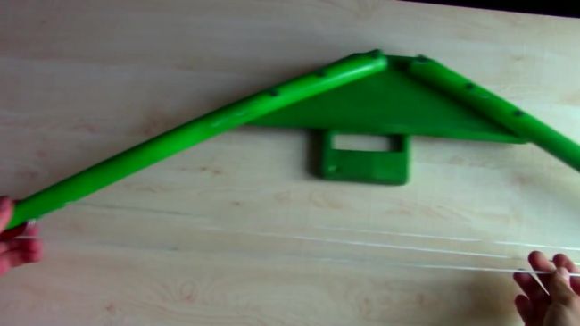 Перейдем к закреплению тетивы. Один конец крепим к верхнему краю плеча, продеваем веревку через два ролика, после чего другой конец фиксируем на другом плече.