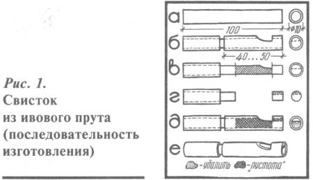 Свисток из ивы. Этот свисток (рис. 1) делают из только что срезанного ивового прута длиной 10 см и диаметром 10 мм. Лучше всего выходят такие свистки в апреле-мае, когда у деревьев наступает период интенсивного сокодвижения и кора с прута очень легко снимается. Итак, выбрав подходящий прут, отрезают от него заготовку (рис. 1,а), на расстоянии 4...5см от любого конца по коре делают круговой надрез шириной 2...3 мм, то есть окольцовывают заготовку, чтобы снять с этого конца кору. Но пока на расстоянии 1 см от того же конца ножом делают небольшое углубление (рис. 1,6). Легкими ударами обушка или ручки ножа простукивают участок надрезанной коры, после чего, обхватив этот участок коры пальцами, слегка проворачивают кору то в одну, то в другую сторону, после чего кора обычно легко снимается с прута (рис. 1,в). Конечно, кору следует снять трубкой. Образовавшуюся окоренную часть отрезают на расстоянии 2...Зсм от края оставшейся коры, после чего уже от этой отделенной части отрезают «шпонку» (рис. 1,г). Осталось от «шпонки» отколоть небольшой сегмент, образуя канал для поступления воздуха (рис. 1,д), надеть на окоренную часть снятую кору, в трубку из коры вставить «шпонку» и свисток готов (рис. 1,е). Тон свиста можно регулировать, перемещая «трубку» относительно неокоренной части.
