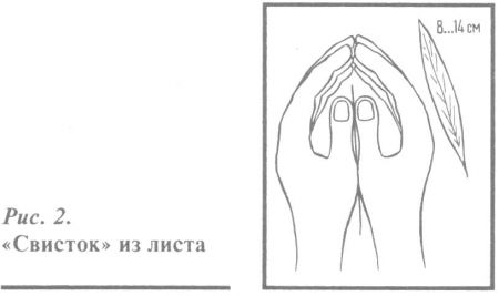 «Свисток» из листа. Сорвем продолговатый лист какой-нибудь злаковой травы, сложим обе руки «лодочкой», зажмем между большими пальцами лист и начинаем дуть (рис. 2). С помощью такого свистка удается имитировать трели соловья, кудахтанье курицы или кукареканье петуха.