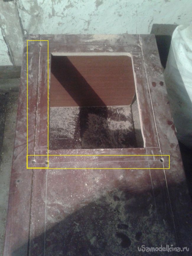 После того, как разметил, я по углам просверлил отверстия для удобного выпиливания лобзиком. На фотографии они хорошо видны.