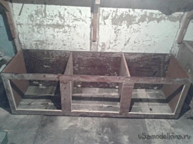 Шаг 1. Для начала собираем прямоугольный короб с перегородками внутри. Это и будет основа нашего крольчатника. Конечно, у кого шкаф стоит дома и его можно вытащить не разбирая, этот этап можно пропустить, так как этот прямоугольник с полками уже готов. Останется только немного его доработать. Частично отпилить крышу и низ и переставить полки по размеру, на Ваш взгляд достаточный для проживания крола.