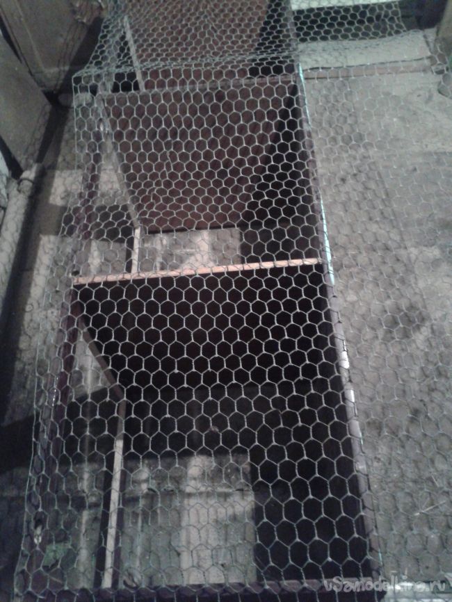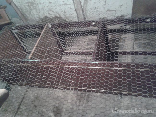 Шаг 6. Следующим моим действием стало прикрепление сетки для пола. Для этого я взял сетку, достаточно крупную, но в то же время такую, что крольчихи и крольчата, когда начнут выползать из гнездовий, могли нормально по ней ходить. Хотя для крольчат она скорее всего будет большевата, но эта проблема решается достаточно легко. Просто подложу кусок фанеры на пару недель, пока крольчата не подрастут.