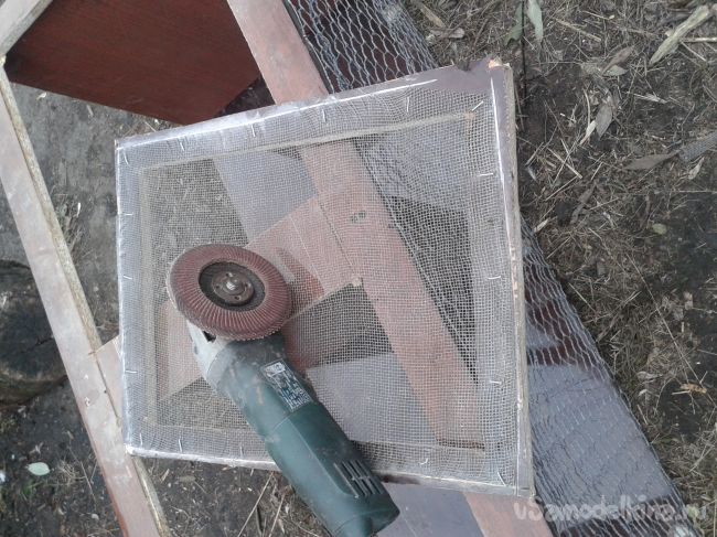 Шаг 8. После того, как сетка была закреплена, нужно удалить все лишнее. Для этого мне понадобилась болгарка с обрезным диском. Обрезая края сетки, лучше надеть какой-нибудь защищающий глаза инструмент, так как могут вылетать разнообразный мусор-срезы металла, деревянные опилки. Лучше подстраховаться
