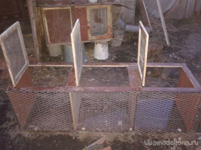как видно, ножки у крольчатника достаточно высокие, так что можно прикрепить туда и металлический наклонный скат, для сбора элементов жизнедеятельности и других прочих отходов животных.