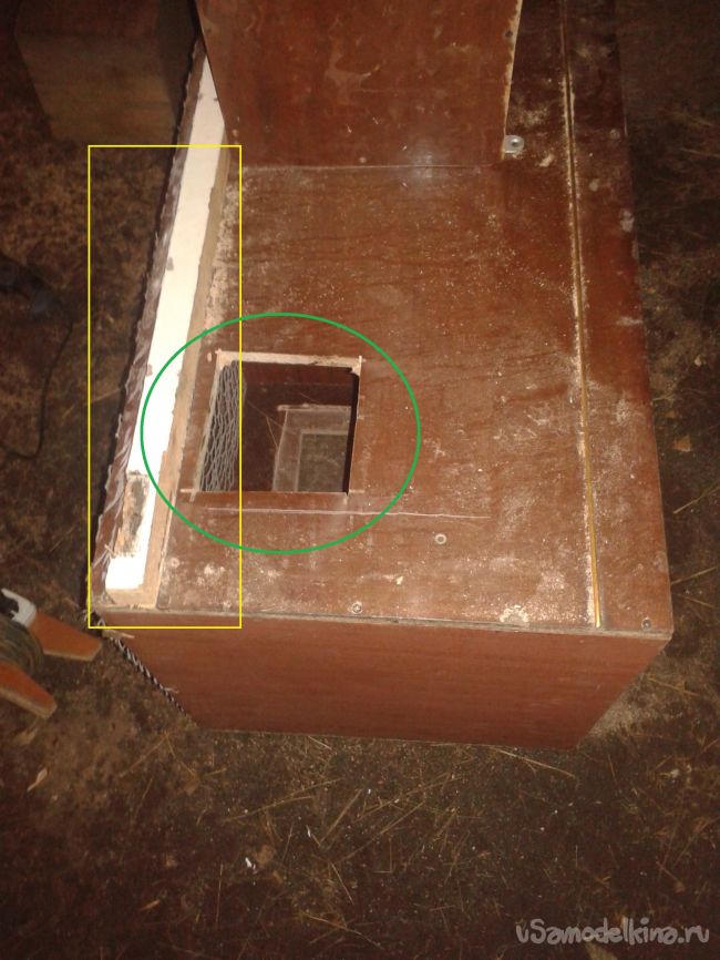 Шаг 15. Следующим шагом стало выпиливание отверстия для доступа в ящик-гнездовье. Отметив на нужном уровне вход я выпилил его. Получилась такая маленькая дверь (на фото отмечена зеленым овалом)