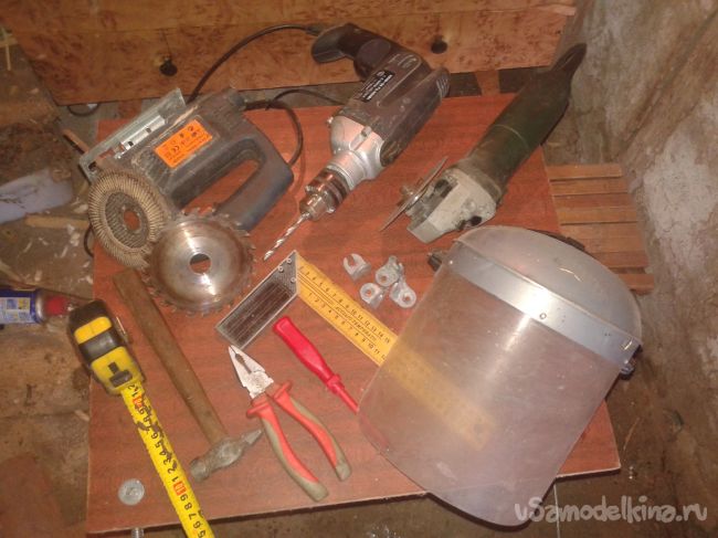 Болгарка с различными дисками (у меня это обрезной диск по металлу, лепестковый диск для шлифовки и диск по дереву, чтобы пилить)