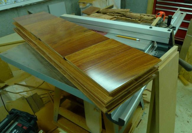 Этап 1. Разрежьте паркетную дощечку на две части, руководствуясь тем масштабам, какие вам нужны для предстоящего изделия.