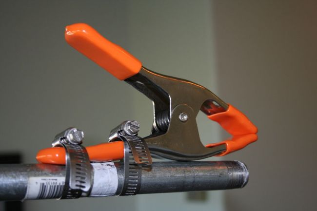 На пружинный зажим накидывается 2 хомута, ими он прикрепляется к верхнему стальному плечу (см. рис. 1). Хомуты регулируются и обтягиваются до достижения надежной фиксации пружинного зажима на трубе.