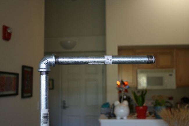 Один оставшийся ниппель в 10” присоединяем к коленчатой трубе. Надежно фиксируем. Получившуюся конструкцию крепим сверху длинной вертикальной трубки.