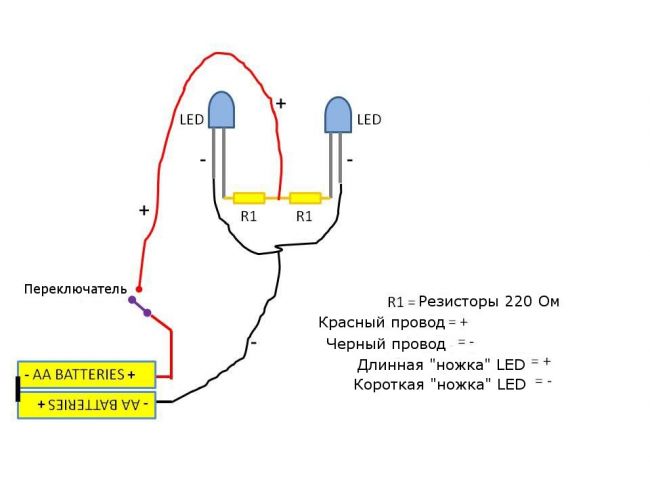 5. Светодиоды большие (2 шт.), сопротивления на 220 Ом (2 шт.)