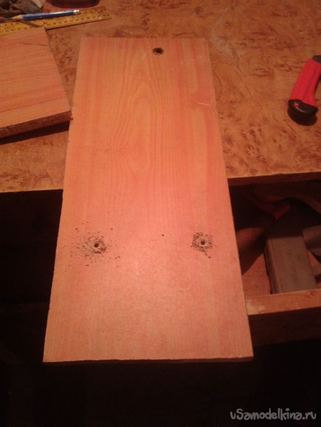 Отшлифовываю часть заготовки и начинаю вырезать ушки. Делаю по три отверстия в каждом –для крепления к полке и крепления на стену.
