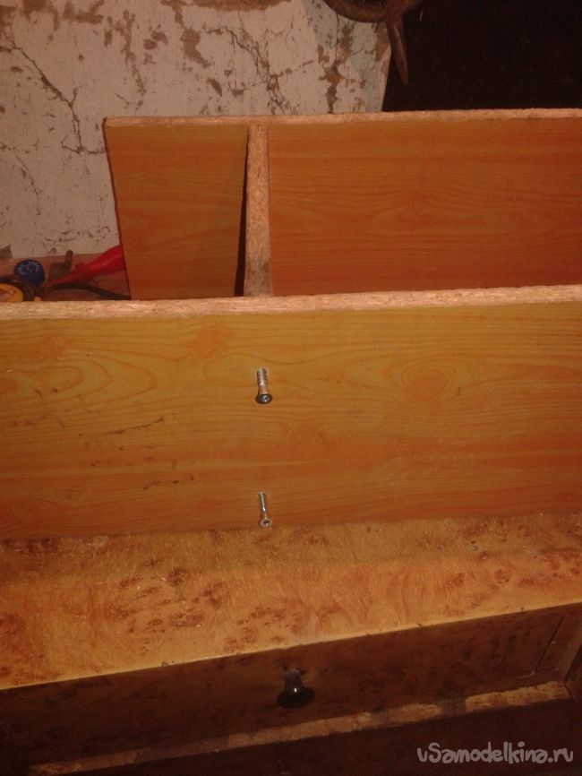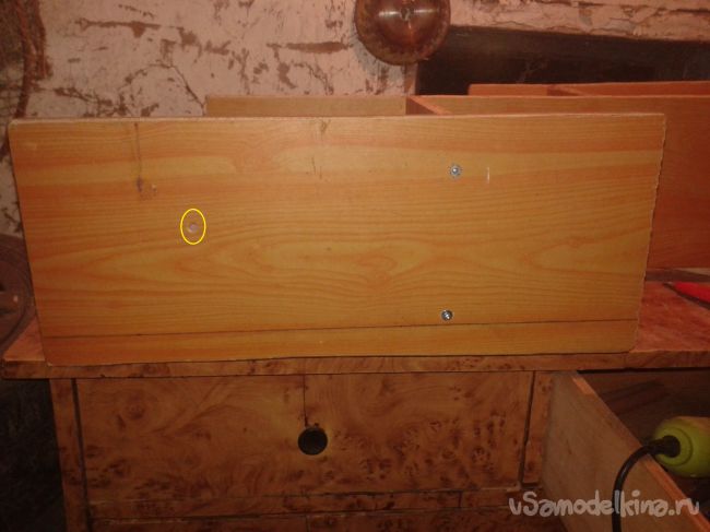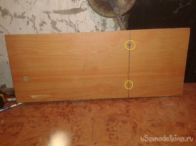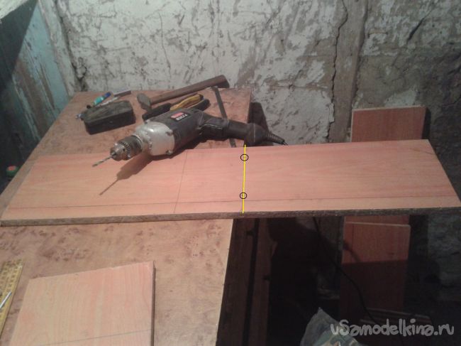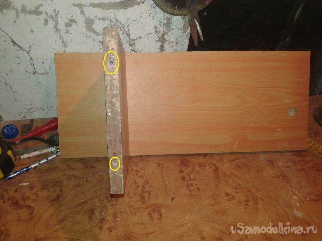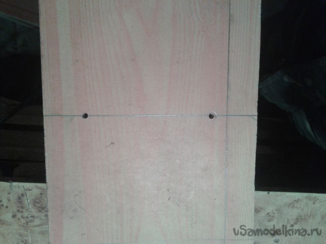 На ней, через 2 сантиметра от края, сверлим отверстия для мебельных саморезов (отмечено черным).