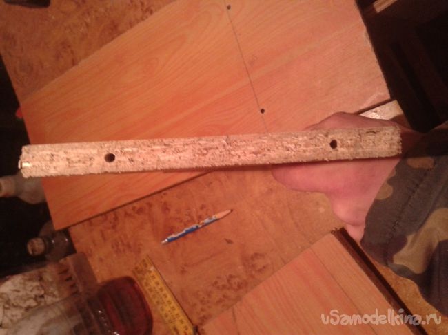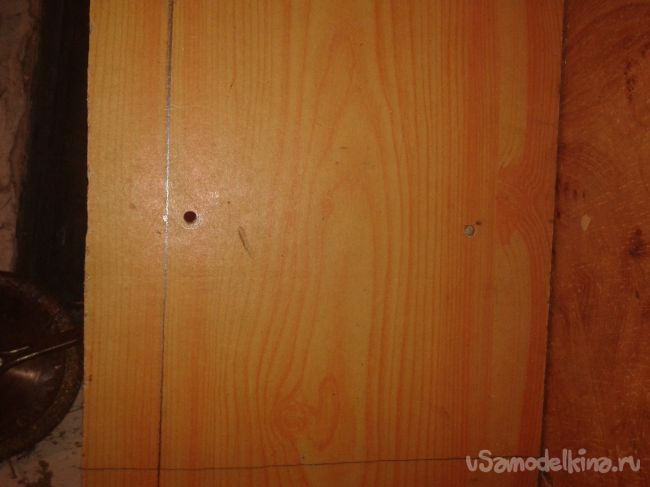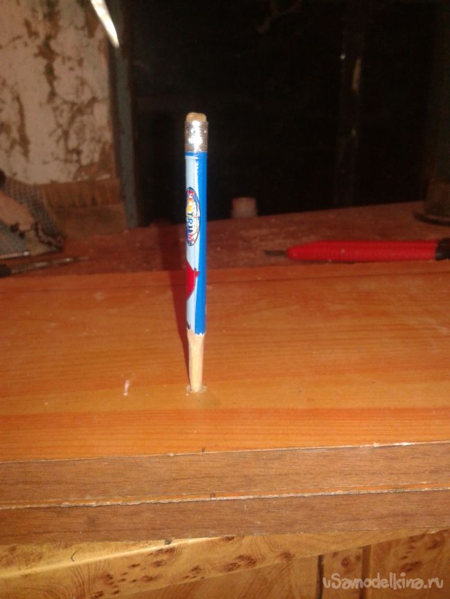 Для удобства отмечания я заточил простой карандашь так, чтобы он смог входить в отверстия заготовок. Можно, конечно и чем-нибудь острым, гвоздем там, или шилом, но потом не видно места отметок. Простым карандашом удобнее и виднее.