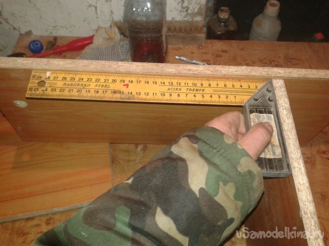Шаг 2. Теперь нам нужно отметить поперечные заготовки, которые будут стенками нашей полки. Для этого я взял следующую заготовку, поменьше первой. Размечаем на ней нужную нам высоту боковинки.