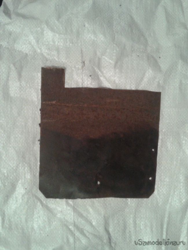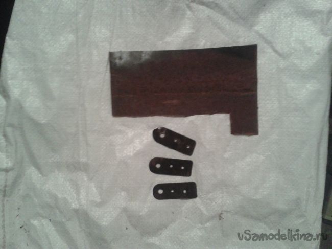 Шаг 16. После того, как закрепили стяжки и полка приняла законченный вид, приступаем к завершающему этапу работы, а именно делаем петельки для того, чтобы вешать полку. Для этого я взял кусок жести. Не очень толстой, но и не тонкой.