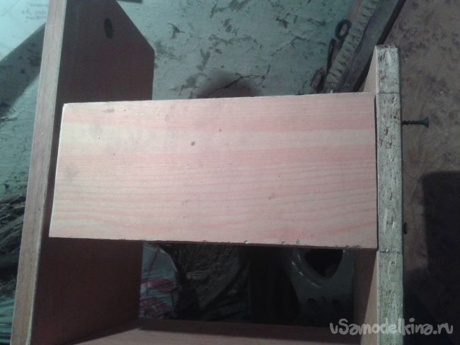 Шаг 17. После того, как наши ушки готовы, мы приступаем к их закреплению на полку. Берем небольшие саморезы по дереву и с задней стороны прикручиваем их. Получается вот так