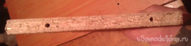Шаг 4. Теперь нам нужна заготовка, которая будет прикрепляться к основной детали. Назовём ее Б1. Я сделал ее длиной сорок два сантиметра. На расстоянии в пятнадцать сантиметров от края размечаем для удобства поперечную линию и отмечаем места, где будем сверлить. Сверлим.