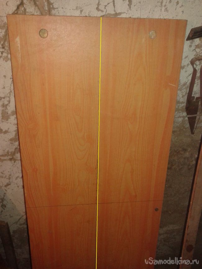 Делаем разметку по всей длине. Делим заготовку пополам. По ширине она равняется пятидесяти двум сантиметрам, поэтому я решил что по ширине моя полка будет двадцать шесть сантиметров. Отмеряем поперек заготовки расстояние, равное восьмидесяти пяти сантиметрам. Это и будет длина полки. (на фото отмечено желтым цветом).