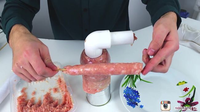 Наконец, нужно надавить на воронку и наблюдаем за появлением люля-кебаба из пластиковой трубки.