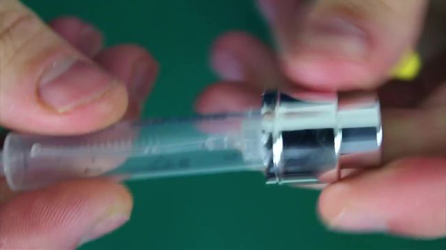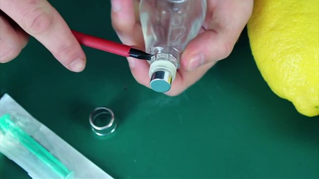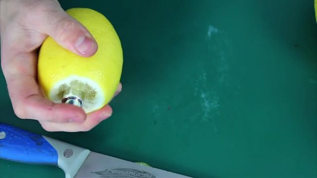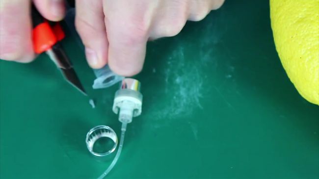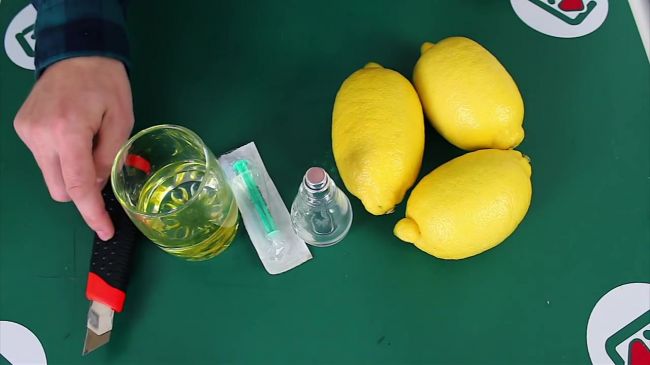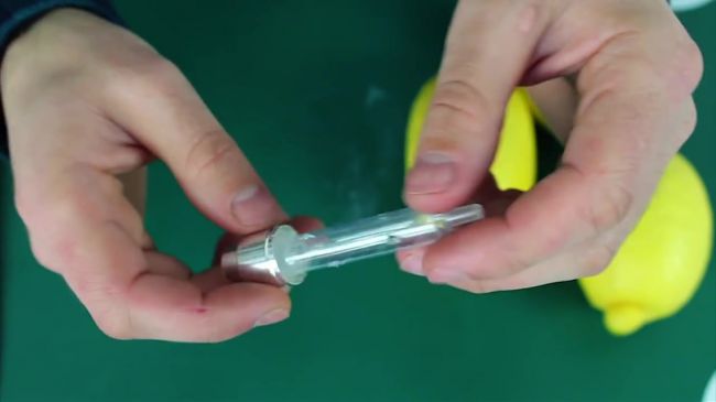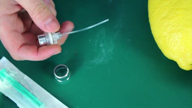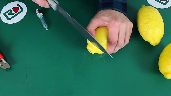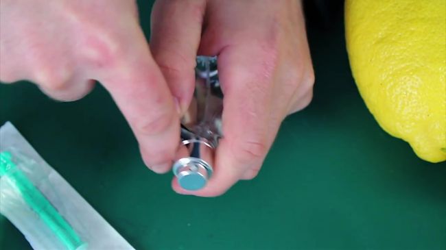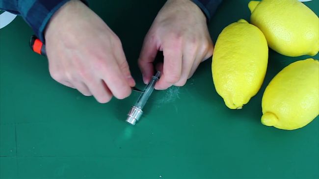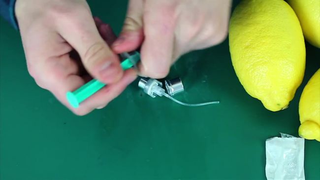Срезаем хвостик лимона, вставляем шприц в цитрус и нажимаем на кнопку насоса.
