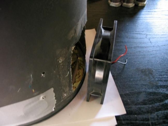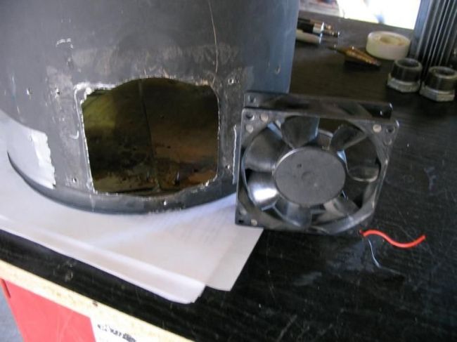 В качестве корпуса будет использоваться большая жестяная банка. Лучше всего для этих целей подходит тара из под керосина. Нужно взять банку и проделать в ней окно для установки вентилятора. Это делается в нижней части банки. Ширина окна должна по размеру подходить к габаритам вентилятора. То есть если вентилятор у нас на 92, то окно нужно вырезать примерно на 88 мм, то есть немного меньше, чтобы вентилятор не проваливался в него.