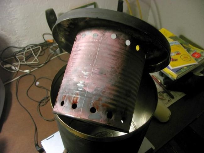 Теперь можно поговорить о маленькой банки, для этих целей подойдет тара из под компота или консервированных овощей. В ней нужно просверлить ряд отверстия, внизу и вверху, как указано на фото. Важно при этом, чтобы отверстия были расположены на одинаковом расстоянии друг от друга, иначе печь или не будет работать вообще, или будет работать неправильно.