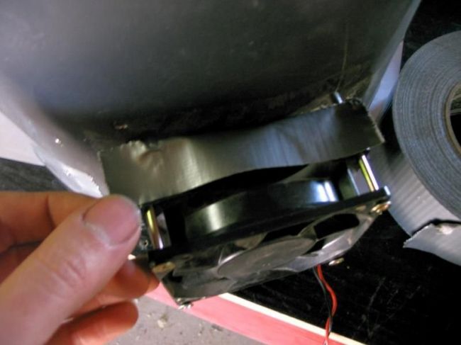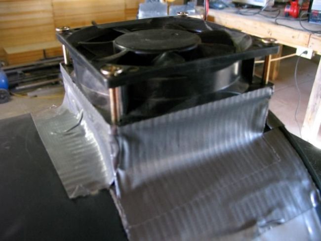 После установки вентилятора останутся большие щели, если их не заделать, воздух просто не будет нагнетаться с нужным темпом в печь. Для этих целей используется специальная клейкая лента для герметизации. С помощью нее нужно тщательно заклеить все щели.