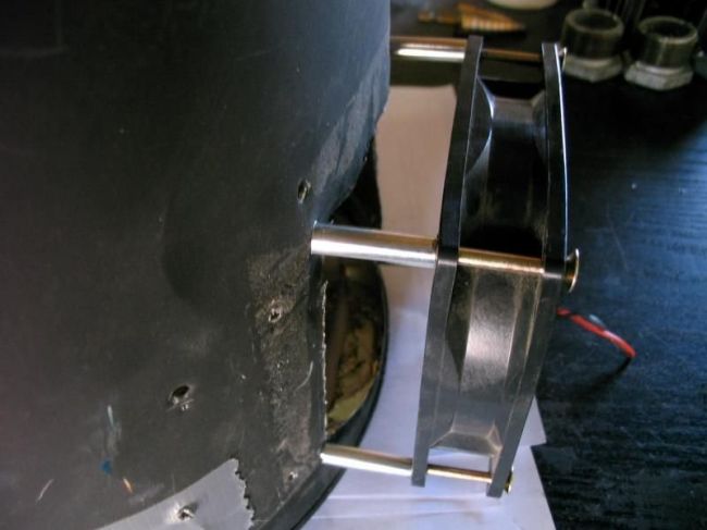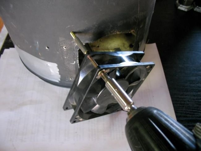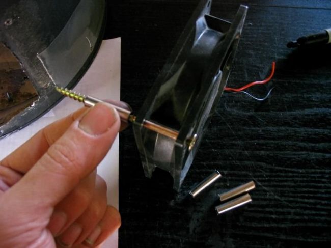 Затем берется четыре длинных шурпа, и вставляются в отверстия вентилятора. Далее на свободные концы шурупов надеваются трубочки. Ну а теперь всю конструкцию можно прикручивать к корпусу печи. Вот и все, на этом процесс сборки можно считать законченным.