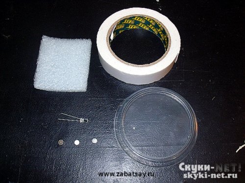 И так для изготовления простейшего самодельного фонарика своими руками нам понадобится: двусторонний скотч, крышка от банки со сметаной, пенополиэтиленовый теплоизолятор, светодиод и батарейки.