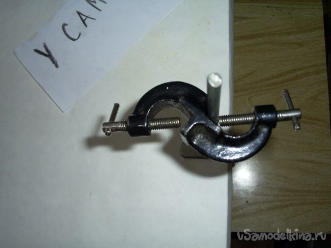 Далее к струбцине крепим зажим, это соединение будет служить не только для удерживания фотоаппарата на весу, но еще для регулирования его высоты относительно поверхности и поворота по горизонтали.