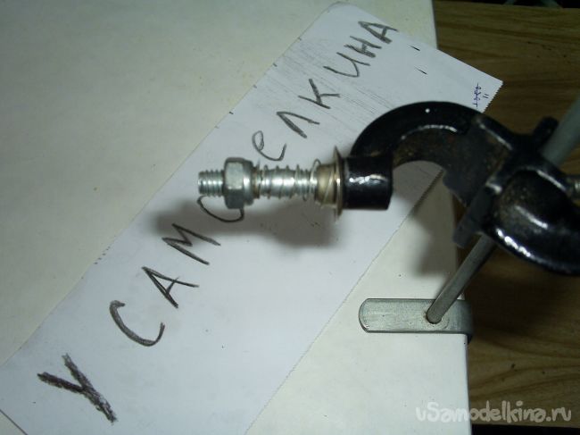 Поначалу шайба пружина и шпилька не подружились. То пружина не того диаметра, то шайба не с тем внутренним диаметром еще и шпилька умудряется быть одновременно тонким и толстым (диаметр шпильки 6 мм, шайбы 7 мм, а пружины вовсе 5 мм). Пришлось, как видите пружину слегка увеличить в диаметре, чтобы она с одой стороны не проходила сквозь шайбу и другой свободно насаживалась на шпильку. Конечно же, можно было бы обойтись и без шайбы, но тогда со временем пружинка стала бы вгрызаться в наш зажим, да и регулировалось бы не так плавно как с ней. (К тому же должно же быть в моей конструкции, хоть какая та деталь честно найденная, где-то, мной).