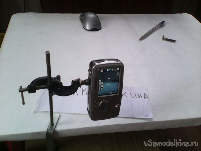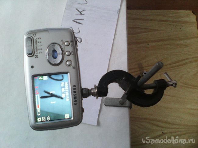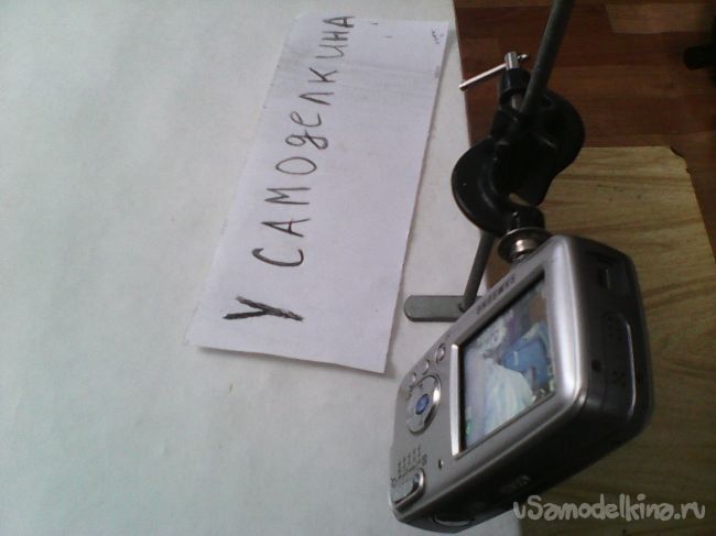 Ну, а поворот по вертикали (кстати немало важная функция при съемке себя любимого или мух не потолке) и крепление самого фотоаппарата будет осуществляться таким же нехитрым приспособлением, состоящим из шпильки диаметром 6 мм (который так же был довольно таки ловко изъят, но только у товарища),