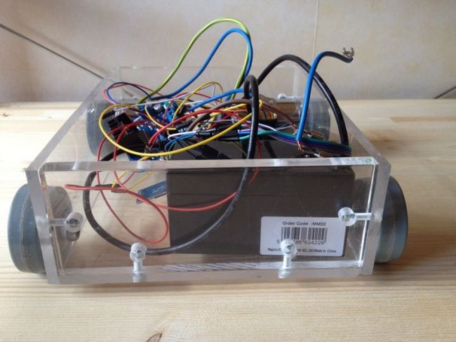 Корпус собирается из пластика длинной 22 и шириной 17см. Два двигателя должны быть подсоединены к валу и зафиксированы резьбовым штифтом.