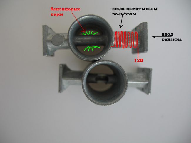 Встала задача, как превращать бензин в газ на выходе из распылителя? Есть уже улучшенные распылители, но они мне не внушают доверия. Появилась идея нагревать распылитель, чтобы бензин в нем мгновенно превращался в пар (газ). Все же логично? Я думаю от такой модернизации качество смеси будет в разы лучше.