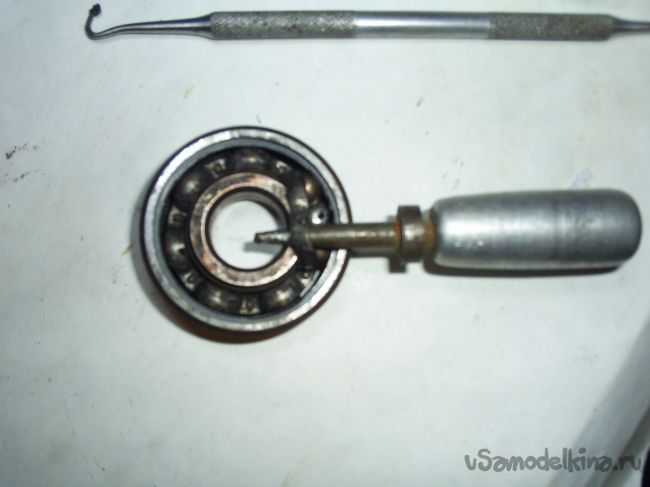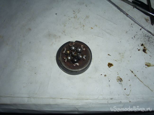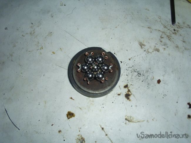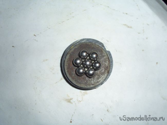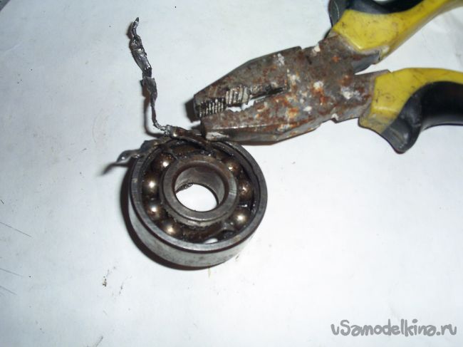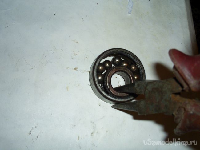 Далее сгруппировав все шарики, плоскогубцами сместил внутреннее кольцо к внешнему кольцу.