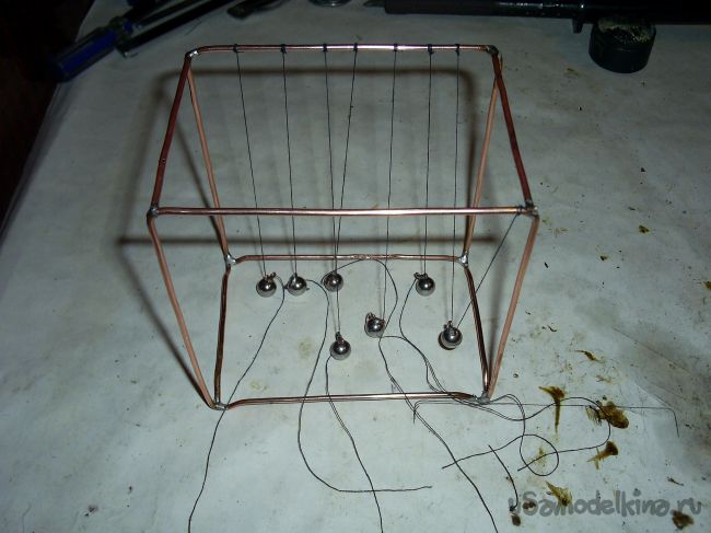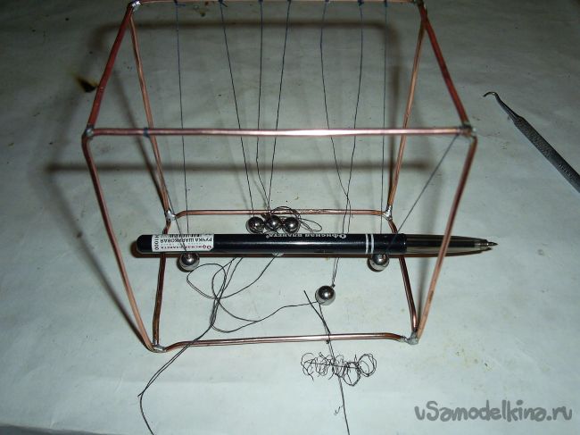 Нитки привязывал, делая несколько оборотов. Это сделано, чтобы при регулировке расположение шариков проворачиванием нитки , она не прокручивалась обратно под весом привязанных к нему шариков. С начала просто привязал нитки на одну сторону получившегося каркаса.