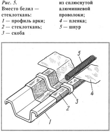 Осенью выяснилось, что у полихлорвиниловой пленки напротив всех «черных» арок с солнечной стороны появились трещины, а на пленке напротив побеленной арки — нет. Я решил, что существенно больший нагрев солнечными лучами пленки, примыкающей к черным поверхностям арок, и способствовал ее ускоренному старению в этих местах. Сначала я надумал смыть лак с арок и затем покрасить их белилами или алюминиевой пудрой. Но дело это оказалось очень трудным, так как сперва надо было разобрать каркас дачной теплицы. Поэтому я принял другое решение. Купив в хозяйственном магазине белую ленту из стеклоткани, я наложил ее на арки с солнечной стороны (рис. 5) и зафиксировал на арках скобами из алюминиевой проволоки. А чтобы уменьшить «выступания» проволоки, я последнюю слегка расплющил молотком на обухе топора, от чего она «утончилась» до 0,8...1 мм и приобрела значительную твердость из-за наклепа.