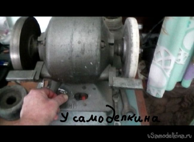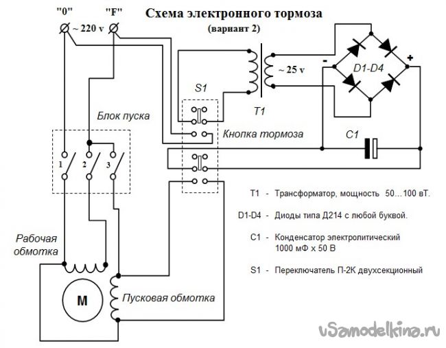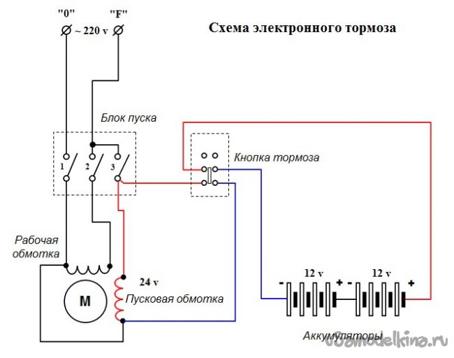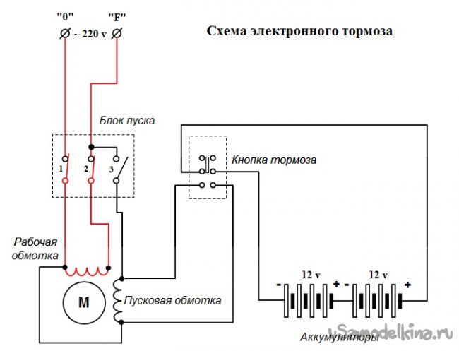 Практика показывает, что если на пусковую обмотку мотора подать 24 вольта постоянного напряжения, то наждак останавливается за считанные секунды.