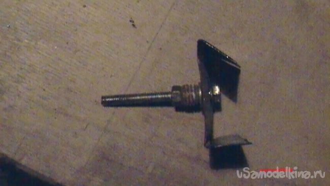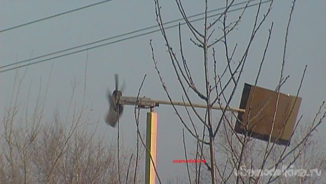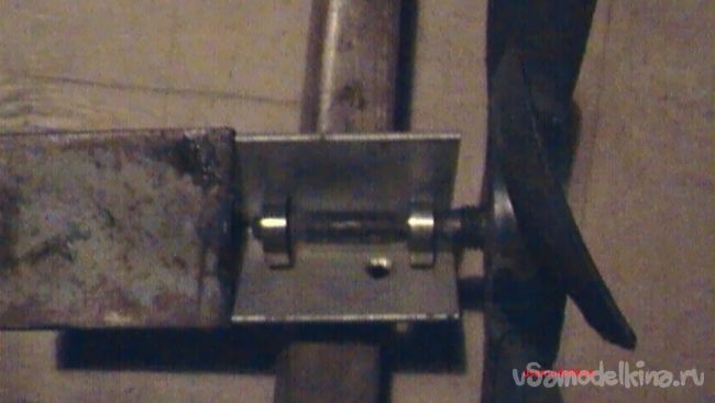 Проточку делал проходным резцом по дереву, пока не «снял» биение. Дальше обрабатывал мелким рашпилем до нужного размера. Подшипники: шариковые однорядные, размерами: 19х7 мм. Надел подшипники на, полученную, ось и отрезал на необходимую длину. Для основания взял алюминиевый уголок с полкой 35 мм и 2 куска жести, толщиной 1 мм. Жесть согнул, так, что бы можно было её надвинуть на уголок. Установил на вал подшипники с вентилятором и поставив в «основание» «ротор» задвинул подготовленную крышку из жести. Во второй жестянке просверлил отверстие ᴓ6.5 мм. Для опоры подготовил: болт с резьбой М6 6х50мм, 2 гайки М6, 2 шайбы, ᴓ чуть больше головки болта и одну большую шайбу. Собрал конструкцию. Затягивать нужно так, что бы жестянка свободно вращалась на болту. В вершине основания просверлил отверстие ᴓ5 мм, а в палочке для оперения 4.5 под резьбу М5. Соединил палочку для оперения с основанием винтом и надвинул вторую жестянку. Молотком обстучал жестянки на уголке (основании) и прилепил груз для регулировки центра тяжести. Для стойки отпилил брусок 2.5х2.5 см и посверлил в торце отверстие 6мм. Сделав вертикальный пропил ножовкой по металлу установил оперение и флюгер вставил в торец бруска. Флюгер готов. Всем желаю удачи в делах.