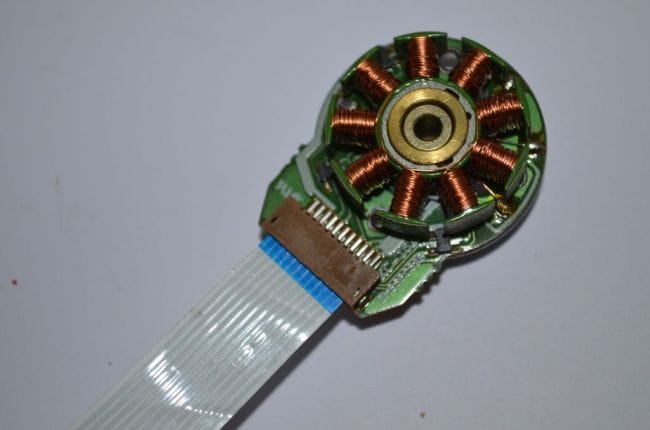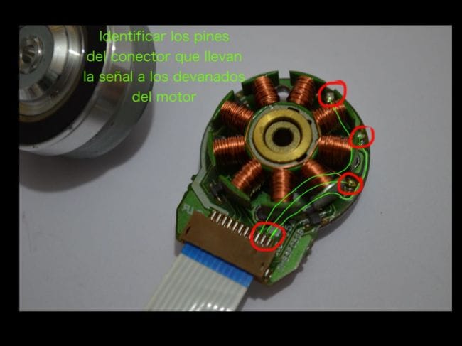 Каждый из двигателей имеет несколько катушек, соединенных вместе в 3 фазы. Надо определить, к каким выводам шлейфа подключены эти три фазы. Это можно сделать, проследив дорожки на печатной плате с помощью лупы.