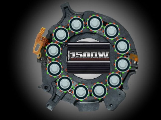 Автор использует двигатели от CD/DVD приводов 12в 1А, что дает 12Вт мощности. Если использовать двигатели от авиамоделей, можно получить впечатляющие результаты, так как есть небольшие двигатели в несколько сотен ватт. Если связать их вместе можно получить мощность в 1500 ватт.