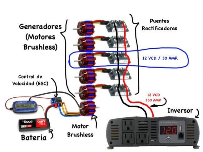 Использовать бесколлекторные двигатели типа OUTRUNNER меньше 1000KV (KV=RPM/Volt). Это позволит получить большее напряжение при меньших оборотах. Если используется группа двигателей, тогда применяйте двигатели с KV больше 2000. В этом случае проще будет их провернуть ,но при более высоких оборотах получите меньшее напряжение. Используйте Arduino или Raspberry PI, чтобы контролировать скорость двигателя и , соответственно, регулировать выходное напряжение.