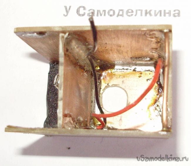 Также в месте крепления задней стенки припаивается скоба из толстой медной проволоки, в которую будет вставляться низ задней стенки.