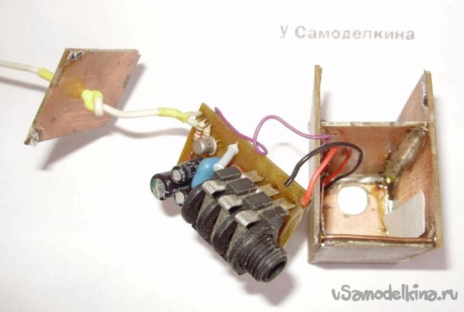 После этого к схеме подпаиваются провода питания и третий провод, связывающий фольгу корпуса и «землю» схемы. Также припаивается экранированный выходной провод, схема устанавливается в корпус и задняя стенка запаивается вверху по бокам.