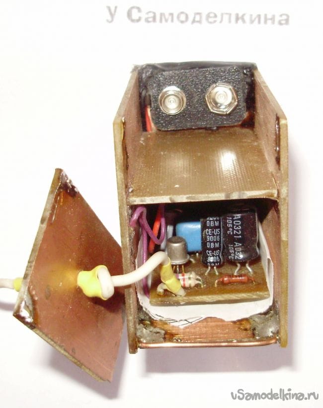 Корпус устройства изготавливается из однослойного текстолита для полного экранирования усилителя.