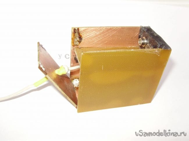 Стенки корпуса спаиваются между собой припоем. Фольга на всех стенках должна оказаться внутри корпуса. Старайтесь не перегревать текстолит, поскольку фольга может легко отслоиться.