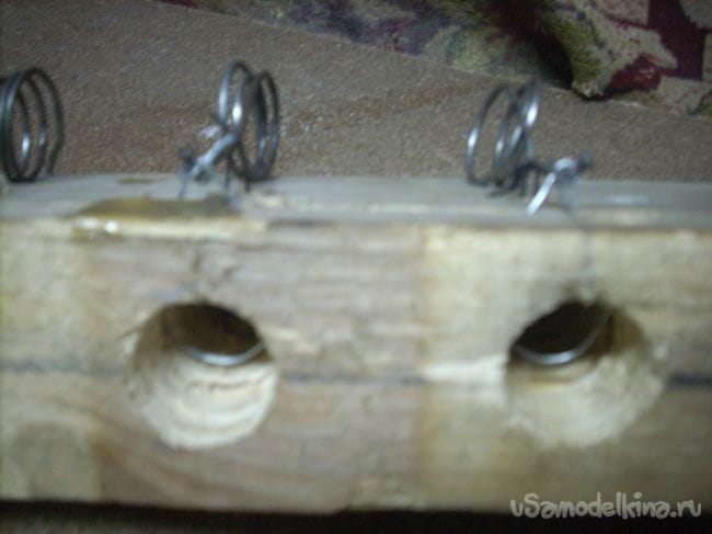 Для начала в торце нашего бруска сверлим "глухие" отверстия, диаметром 20 мм, и глубиной 8-10 см. (Брус должен быть шире сантиметра на два). (Это будут "норки" для мышей). Я это сделал при помощи разводного перьевого сверла по дереву и обычной дрели. После этого нам нужно выполнить пропил вдоль всего бруска, отступив примерно сантиметр от того края, где мы сверлили глухие отверстия. Глубина пропила должна доставать до нижнего края наших отверстий. Я выполнил его с помощью круга по дереву и 125-й малой "болгарки" (УШМ). Его можно выполнить циркульной пилой (циркуляркой), или, даже ручной ножовкой . Но в этом случае у вас не получится сделать мышеловку больше чем на 3 норки - не хватит длины полотна ножовки. Следующий шаг - на расстоянии примерно двух-двух с половиной сантиметров от нашего пропила, сверлим поперёк бруса по два отверстия, диаметром 2мм. Они должны пройти поперёк каждой норки, разделив её на равные части. Для наглядности я вставил в просверленные отверстия проволоку: Этим же сверлом сверлим отверстие в бруске там, где норка уже закончилась. Получаем вот такое изделие: Далее, мы приступаем к изготовлению пружины. Она выполняется из спицы от велосипеда. В качестве шаблона я использовал ручку от напильника, диаметром 20 мм: Приступаем к сборке. Пружины вставляем в отверстие, просверленное нами напротив каждой норки: После этого на конце каждой пружины закрепляем петлю из вязальной проволоки: И заряжаем мышеловку: Сжав пружину так, чтобы проволочная петля опустилась в наш пропил, фиксируем её, вставив что-нибудь, подходящего диаметра. Я использовал тот-же напильник: После этого просто привязываем пружину нитью, пропущенной через два наших отверстия. Я использую "цыганскую" иголку, чтобы легче было продеть: После этого убираем напильник и помещаем в торец норки приманку. Лучше, сильно пахнущую. Я использовал кусочки поджаренной до корки шкурки от сала. (Это можно сделать и в начале. Даже удобней - нитки не мешают)