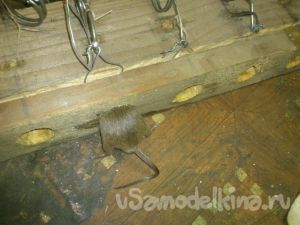 Что мы имеем: проволочная петля, которая по диаметру больше норки, полностью прячется в пропиле и не перекрывает норку. Мышь, видя нору, естественно, постарается её исследовать. Тем более, что из неё аппетитно пахнет! Пройдя петлю, она упрётся в нитки, преграждающие ей проход... и попросту перегрызёт их!! (Не сомневайтесь, проверено. ) Дальше - понятно. Высвободившаяся пружина тут-же рванёт проволочную петлю вверх... Всё!!! До приманки ещё ни одна не добралась))))) При этом, торчащий из норки хвост мыши не отпугивает других! Остальные норки-то свободны! По приезду на дачу, я иногда вытряхиваю, прижав пружины, по 10 мышей! Всё, что надо - новая нитка. Приманка служит долго.
