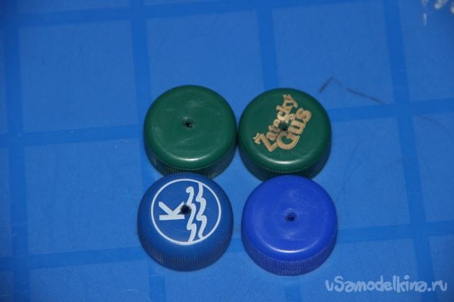 Шаг 3: Затем берём палочку длинной 105 мм. Далее в крышках делаем отверстия и устанавливаем их на каркас машинки.
